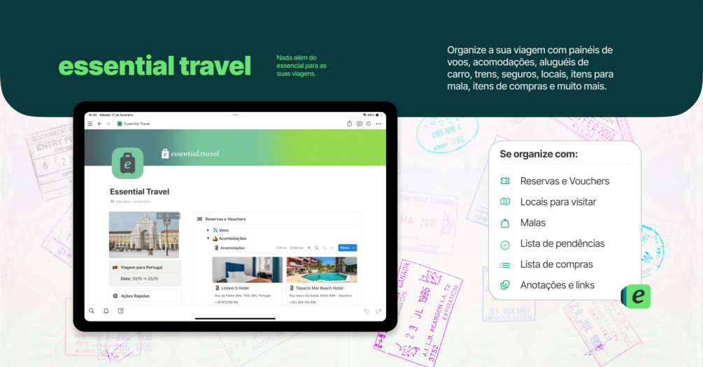 Viajar é como um projeto. Você precisa se organizar, planejar, e ter tudo registrado para que tudo saia como você sempre sonhou. Neste template de Notion, você encontra: